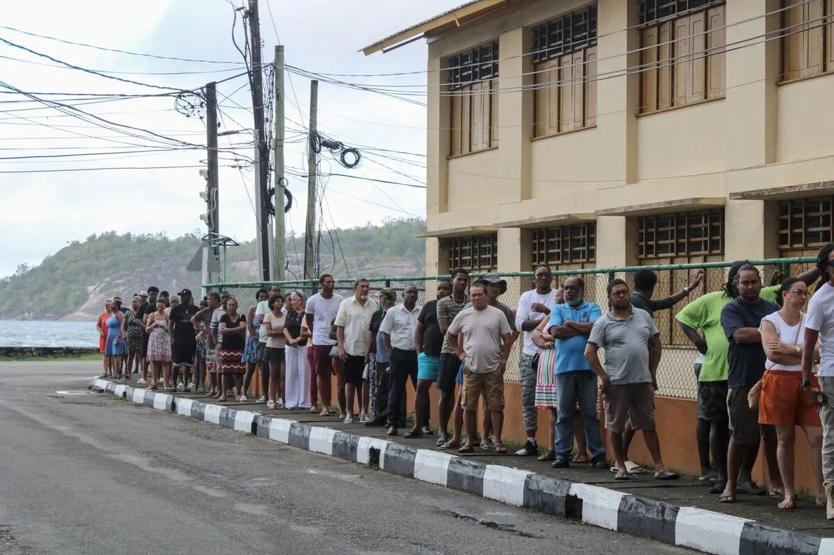 Voters queue at a polling station during Seychelles’ presidential and parliamentary elections in Victoria on Sept. 27.