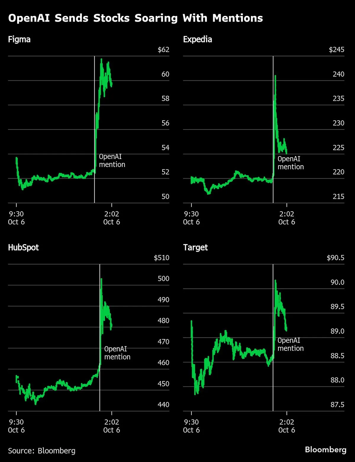 The company behind ChatGPT held its annual developers event Monday, and mere mentions of other publicly traded firms by presenters sent those shares soaring. Among notable movers: Figma Inc. climbed 7.4%, HubSpot Inc. added 2.6% and Salesforce Inc. gained 2.3%. Online travel companies also saw brief pops, with Expedia Group, Inc. and TripAdvisor Inc. both advancing at least 7% before paring those gains. Even shares of toymaker Mattel Inc. jumped nearly 6%, though it closed essentially flat.