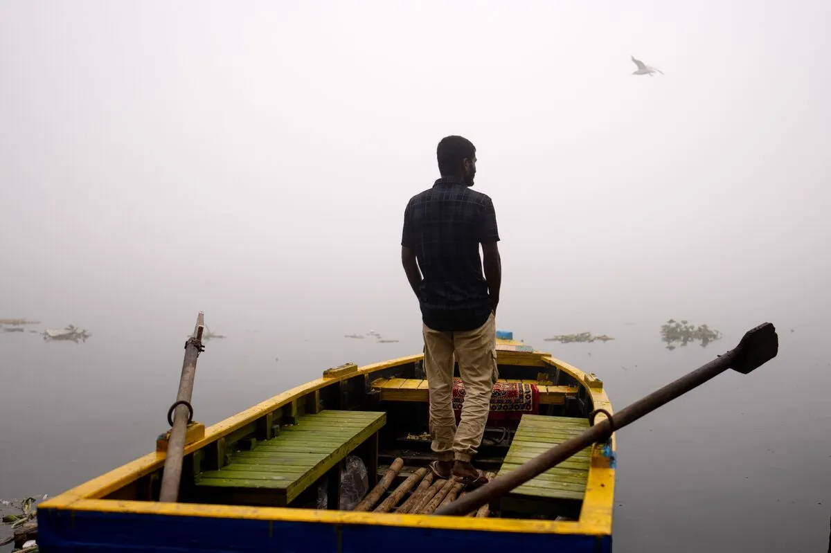 A boat navigates the smog-covered Yamuna River in New Delhi on November 14.