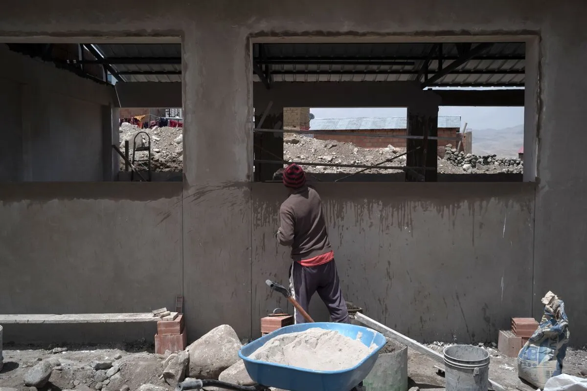 A worker renovates a school in the town of Pamputa, Apurimac department, Peru.