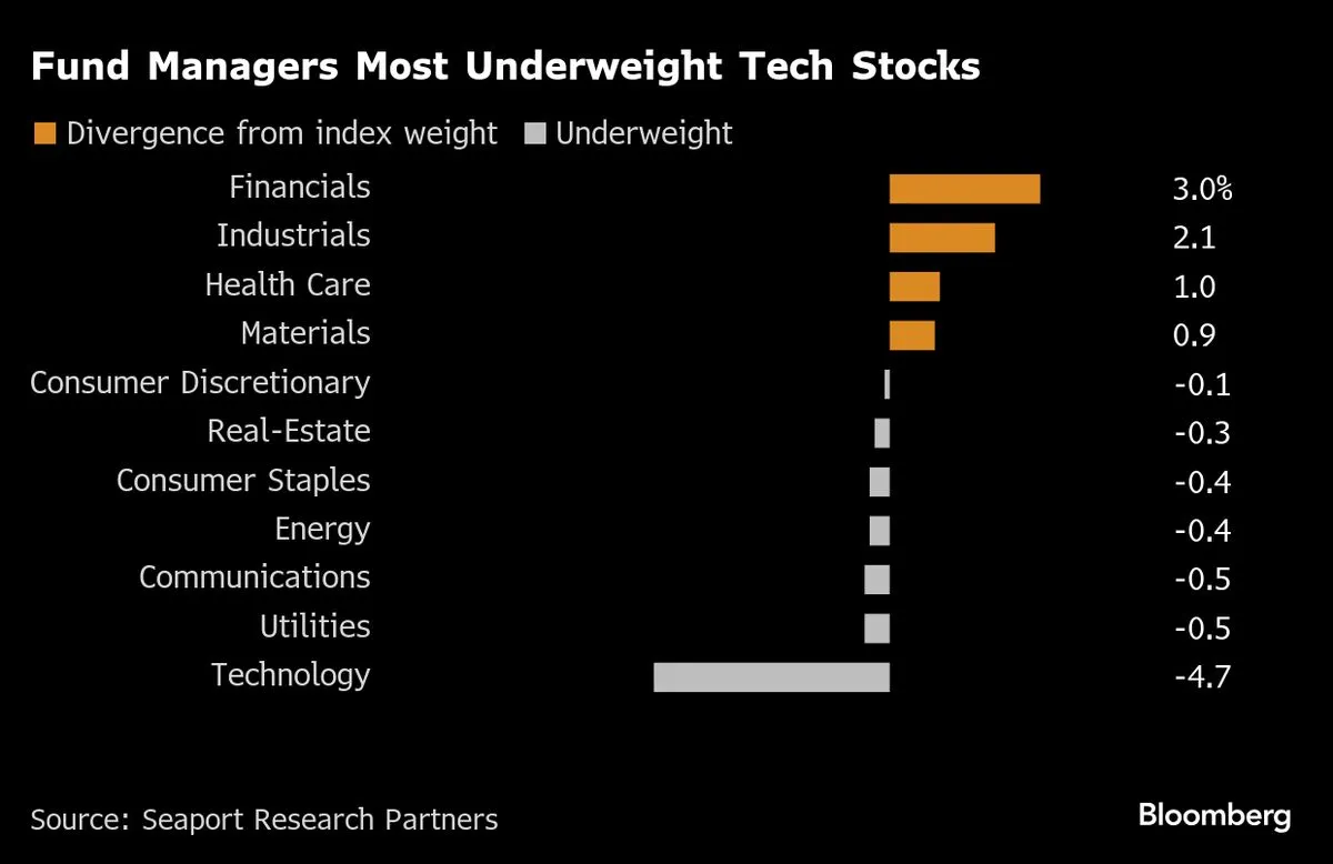 Mutual fund managers have been paring back holdings of Nvidia Corp., Apple Inc. and Broadcom Inc. in the past three months, which reduced their technology exposure to 30%, almost 5 percentage points below the group’s weight in the S&P 500 Index. That’s their biggest relative underweight in five years, data compiled by Seaport Research Partners show.