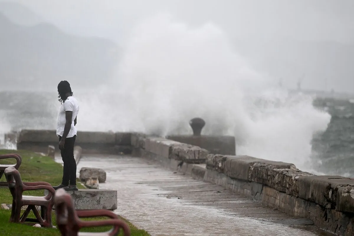 A local resident observes powerful waves crashing against the Kingston Waterfront in anticipation of Hurricane Melissa’s imminent landfall on October 27.
