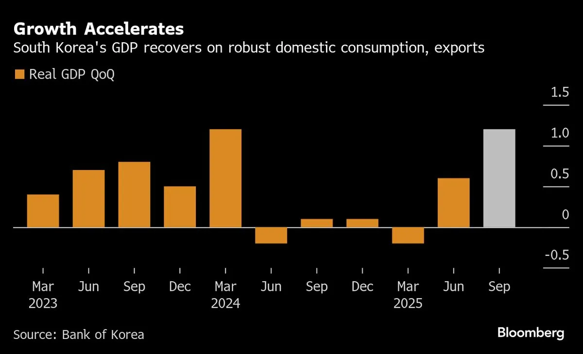 South Korea’s economy gained momentum last quarter, bolstering the case for authorities to refrain from adding monetary stimulus as they weigh the need to rein in a sizzling housing market against the expected impact from US trade policies.